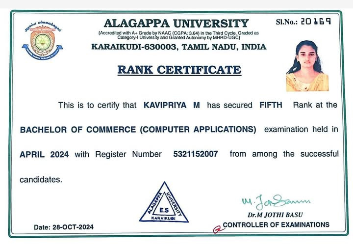 B. Com with Computer Application Batch(2021_2024) has secured University fifth Rank